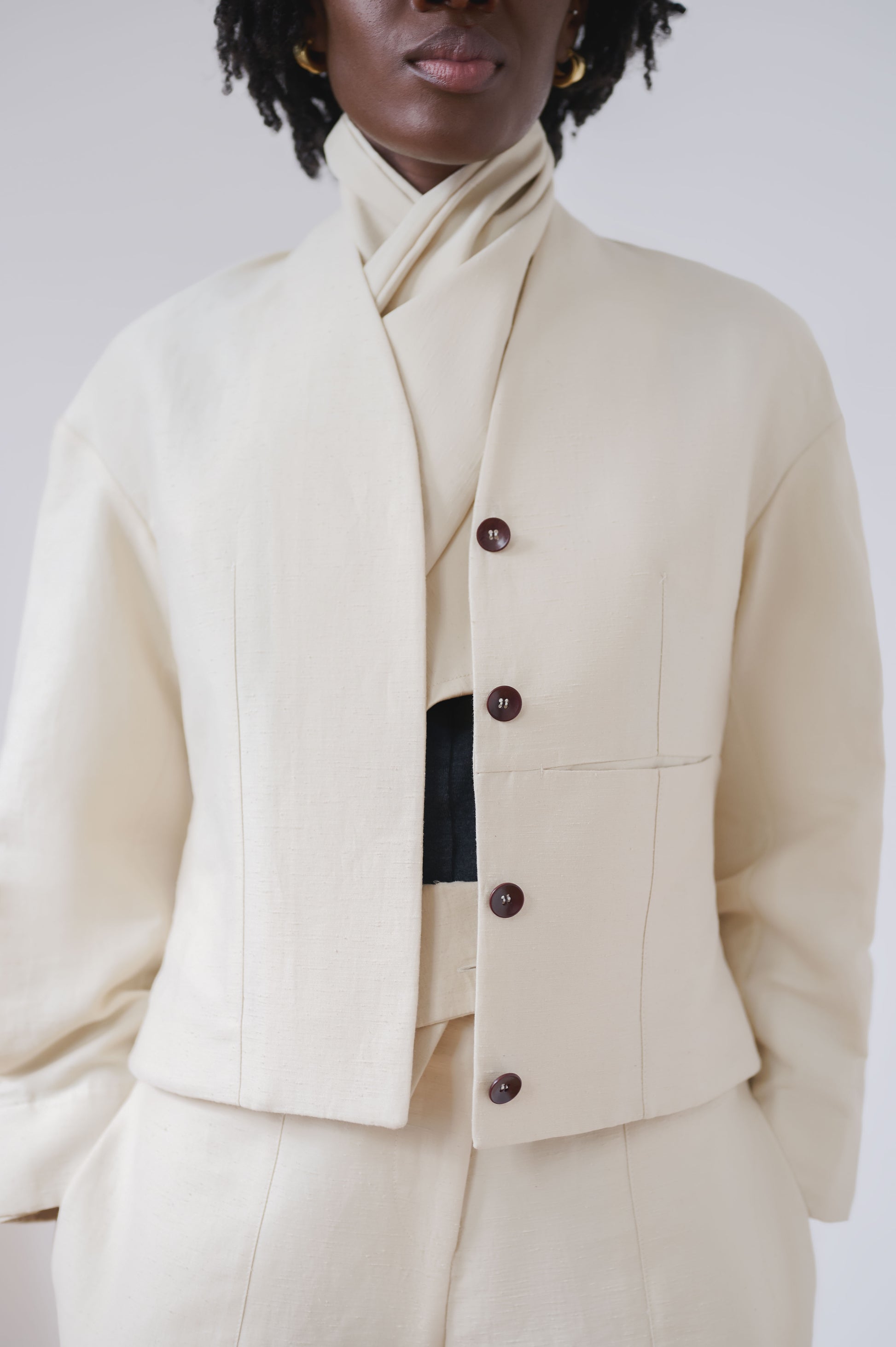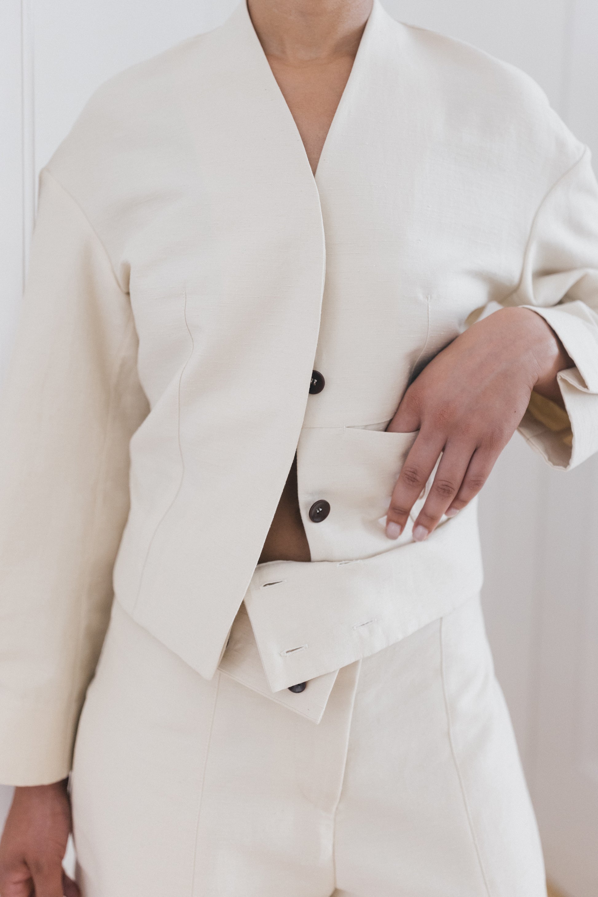 A tailored, medium weight jacket made from a deadstock italian cotton.